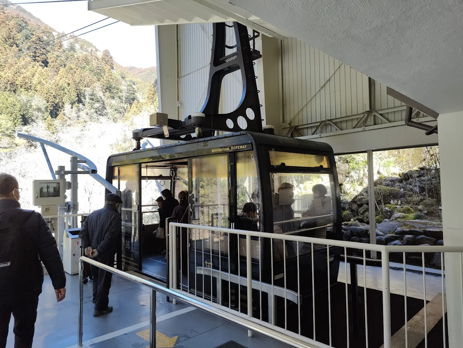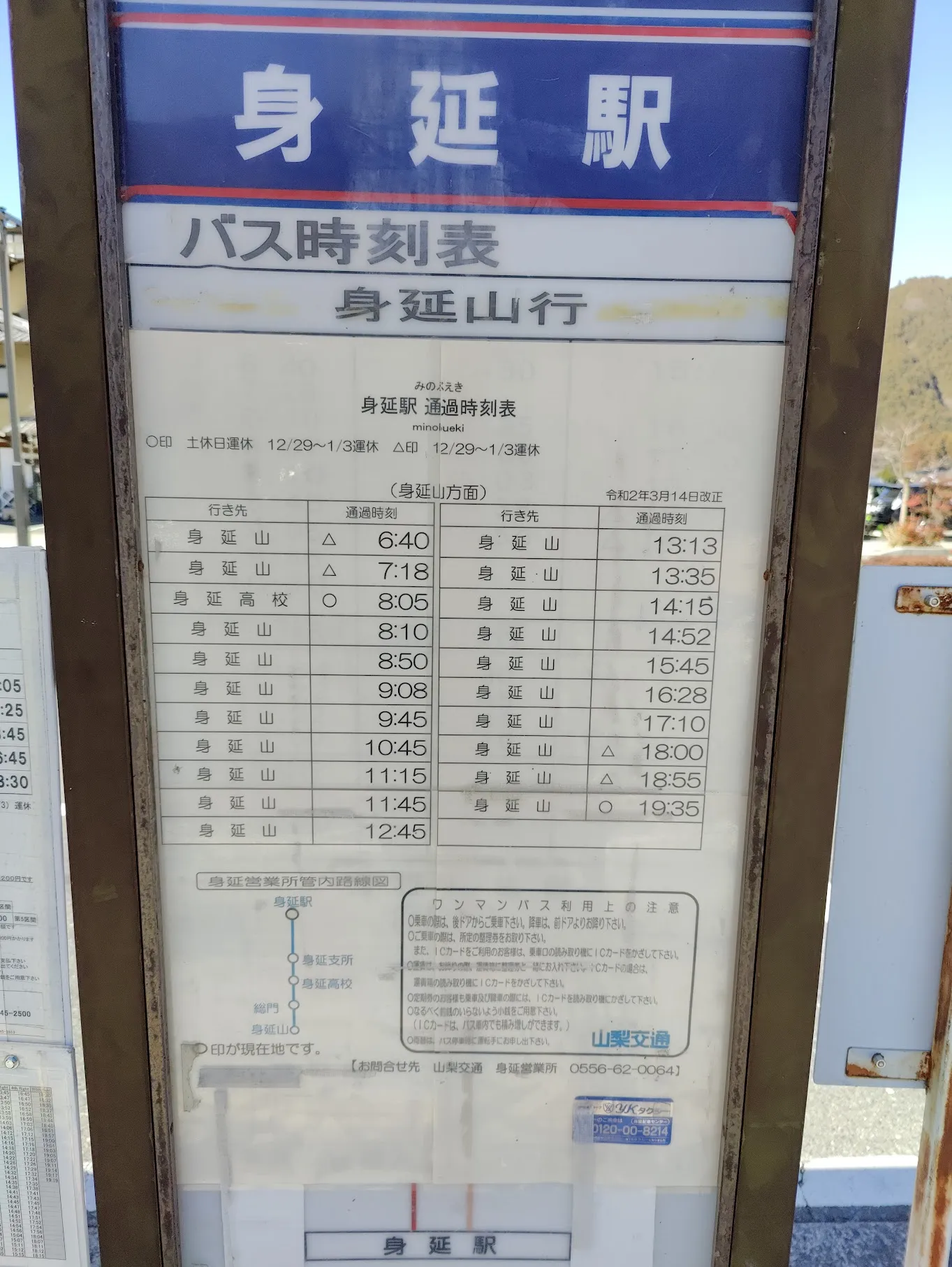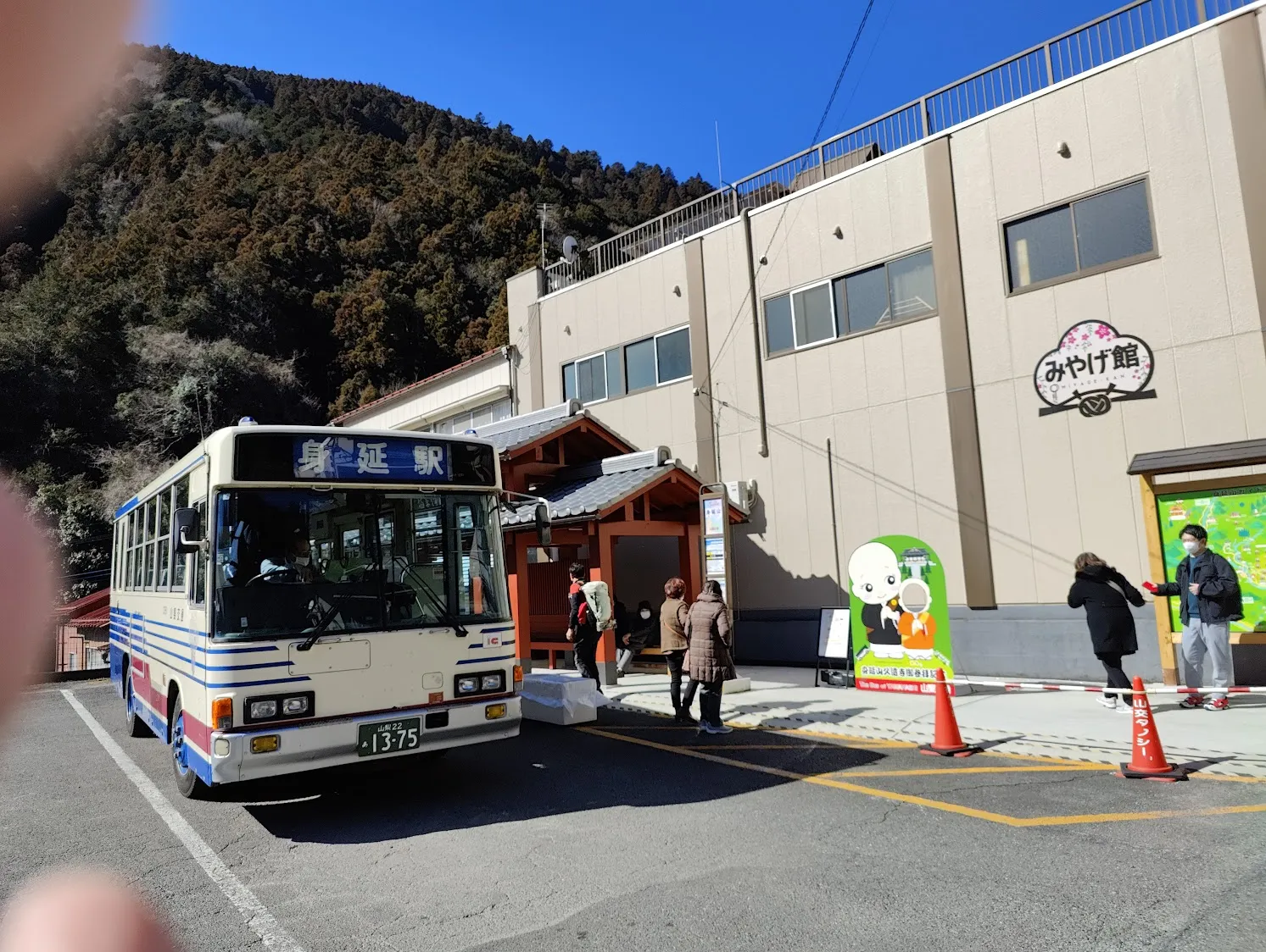 The train ride from Kofu to Minobu takes about an hour and 30 minutes. From Minobu station, a bus runs to the temple approximately once an hour. Fortunately, the schedule is well-coordinated, and I only had to wait for about 20 minutes. There are a few souvenir shops near the station where you can pass the time easily.